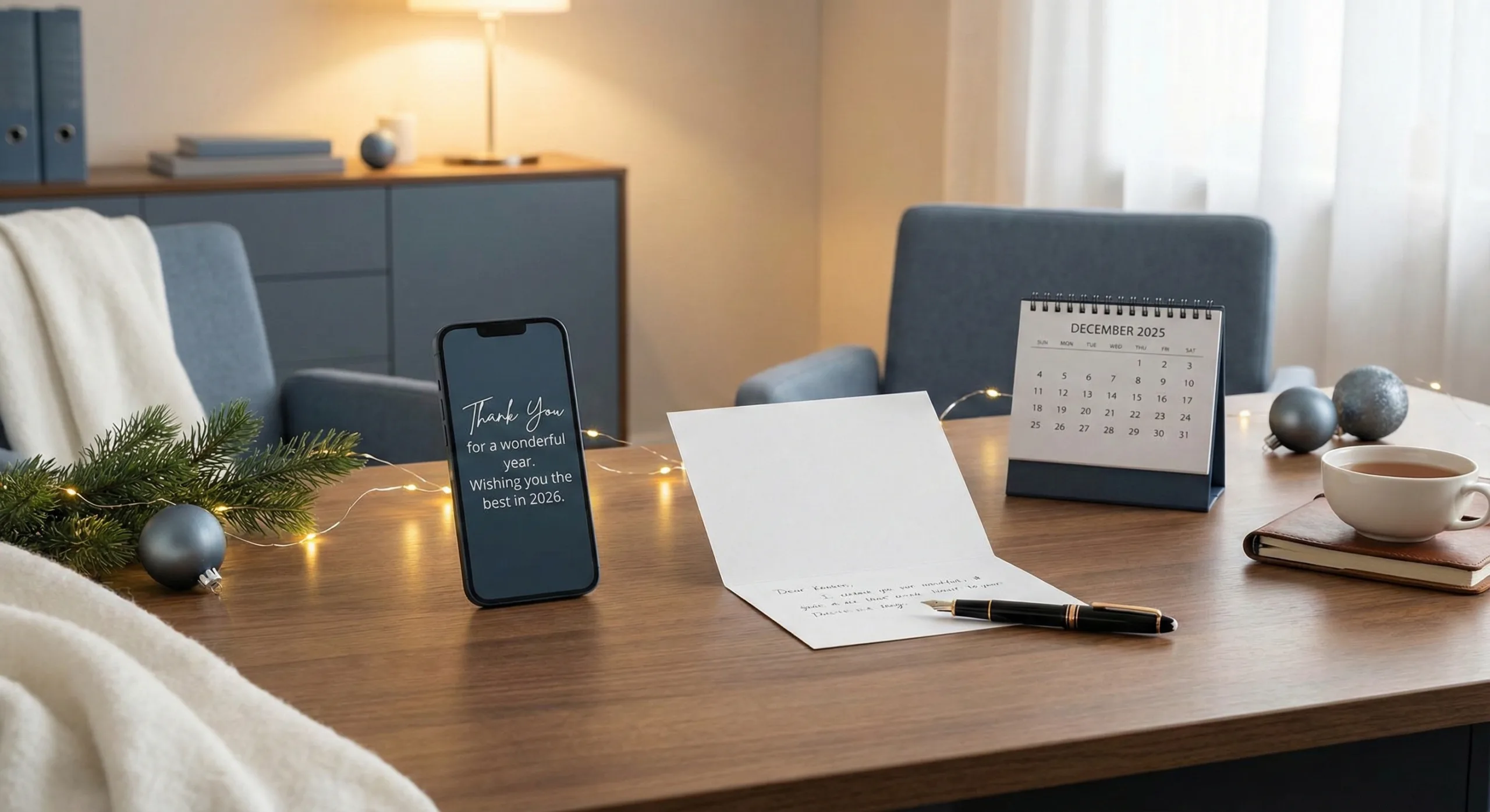 2025년 12월이 표시된 작은 달력과 부드러운 조명 등 은은한 연말 장식으로 꾸며진, 따뜻하고 전문적인 느낌의 사무실 배경